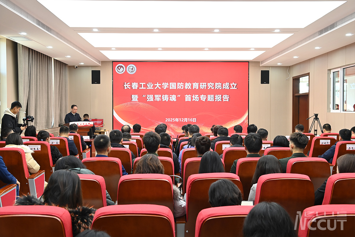 12月16日上午,长春工业大学国防教育研究院成立暨“强军铸魂”首场专题报告会在北湖校区举行。吉林省国防动员办公室党组书记、主任韩阳,长春警备区大校政治委员李建厂,吉林省委宣传部部务会成员张大鹏,吉林省教育厅党组成员、副厅长许治,吉林省军区政治工作局宣传处上校处长段锐,长春警备区政治工作处上校主任张焕荣,朝阳区人民武装部上校部长于洋等军地部门领导与学校党委书记陈权、校长付跃刚及师生代表共同见证这一重要时刻。活动由副校长胡刃锋主持。