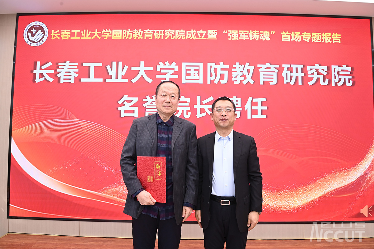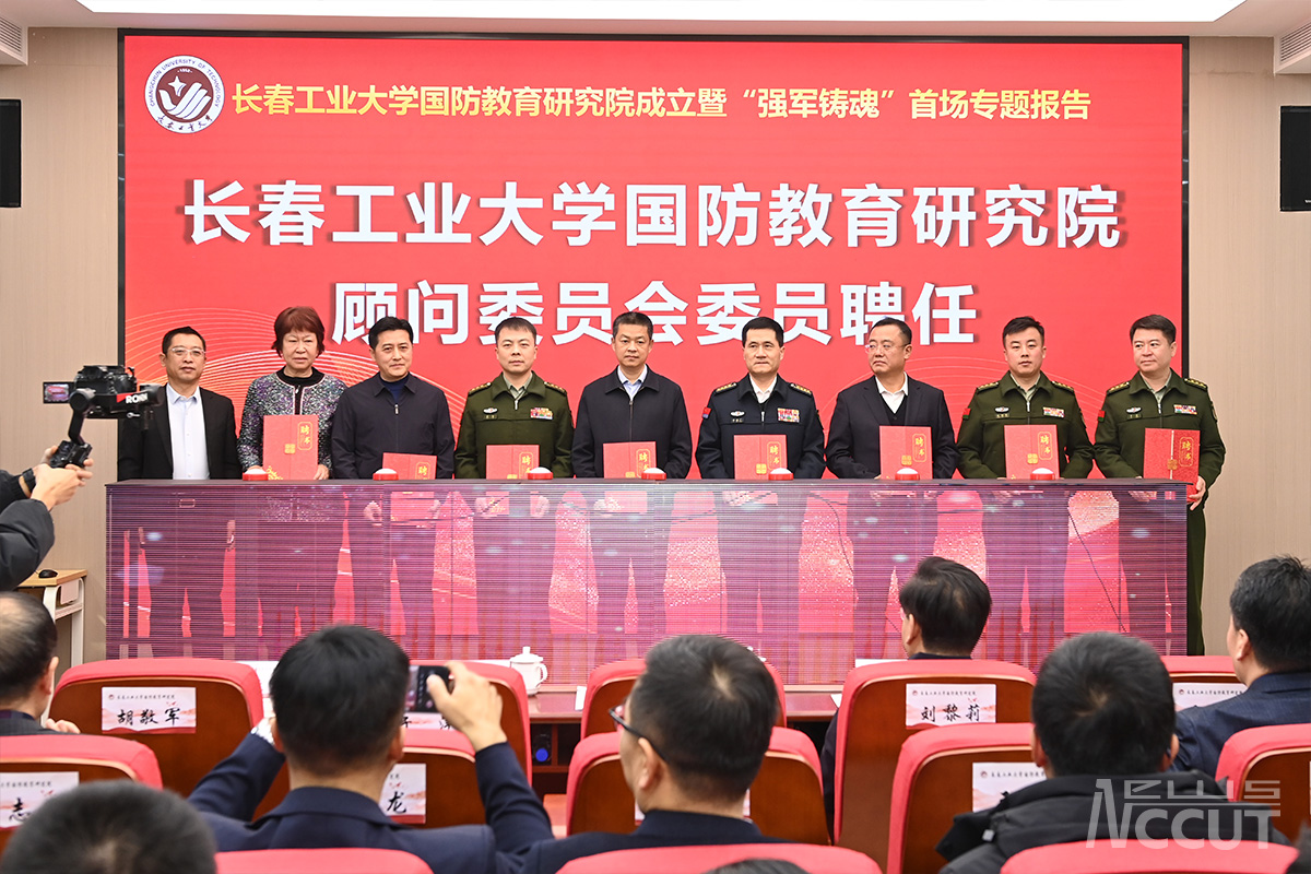 在热烈的掌声中,军地领导共同为“长春工业大学国防教育研究院”揭牌。付跃刚为研究院顾问委员会委员、名誉院长颁发了聘书。