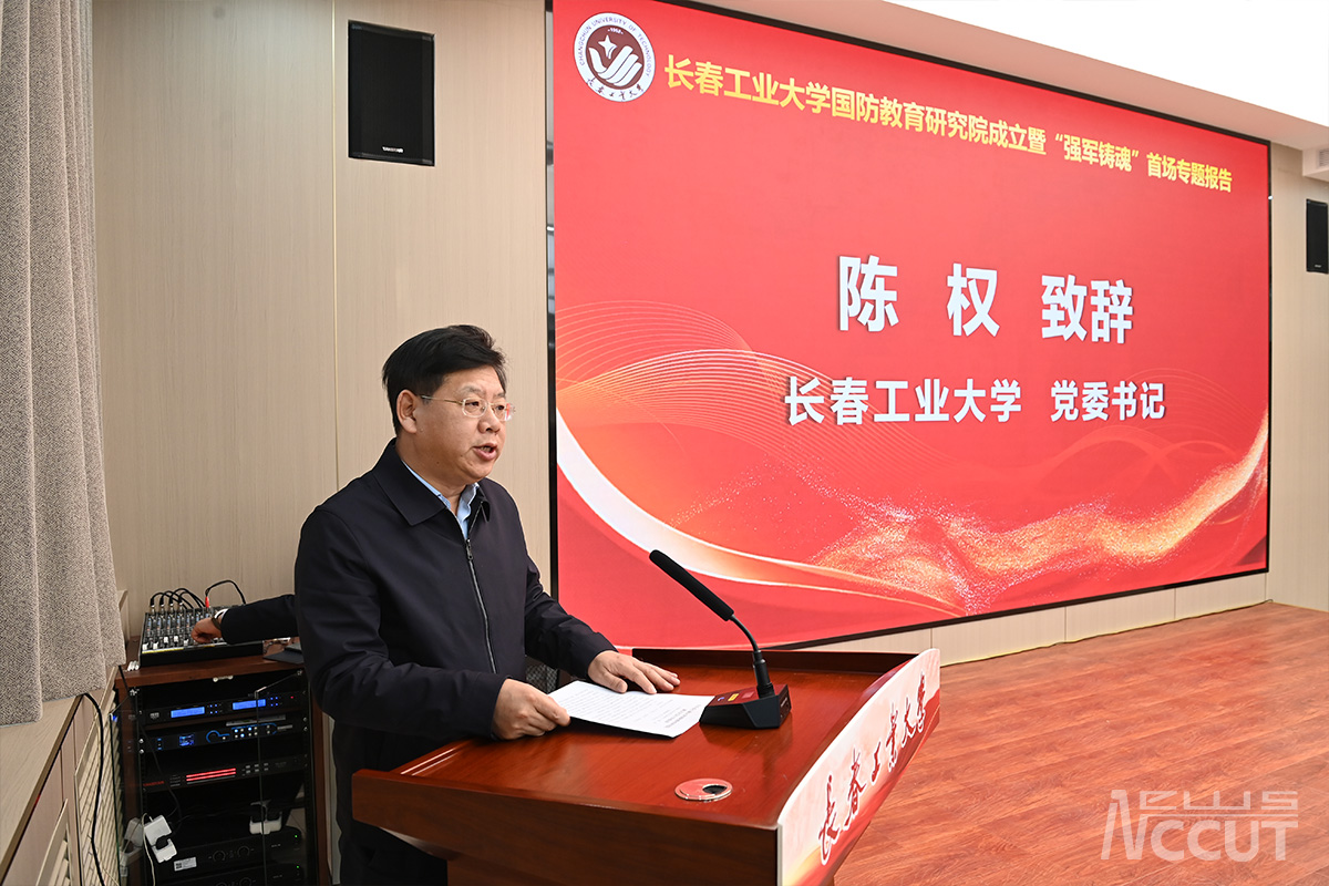 陈权在致辞中指出,成立国防教育研究院是学校深入学习贯彻习近平强军思想和习近平总书记关于加强全民国防教育的重要论述,主动服务国家战略需求,将国防教育深度融入立德树人全过程的关键举措,标志着学校国防教育工作迈向体系化、学理化的新发展阶段。研究院要致力于打造理论研究新高地、铸牢人才培养主阵地、建设决策咨询强智库,为巩固国防、服务军队现代化建设贡献“工大智慧”。